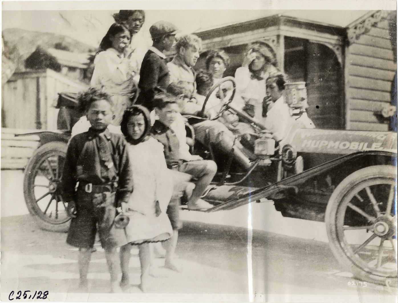 Close-up view of children and spectators posing with driver Hupmobile car in New Zealand during the 1910 Hupmobile Round the World tour. The expedition, which left from Detroit, Michigan, was a demonstration of Hupmobile efficiency throughout the U.S., Hawaii, the Fiji Islands and New Zealand. Handwritten on back: "New Zealand. Tours--Hupmobile Round the World Tour, 1910."
