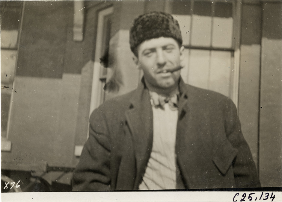 Close-up view of driver, wearing fur cap and smoking a cigar, posing in front of building during the 1910 Hupmobile Detroit to New York tour. For this endurance run, the Hupp Motor Company sent three Hupmobiles in early January from Detroit to New York for exhibit at the Grand Central Palace Automobile Show. Stamped on back: "Spooner & Wells, Inc., photographers, telephones 3472-3473 Columbus, 1931 Broadway, New York." Handwritten on back: "Tours--Hupmobile Detroit to New York Tour, 1910."