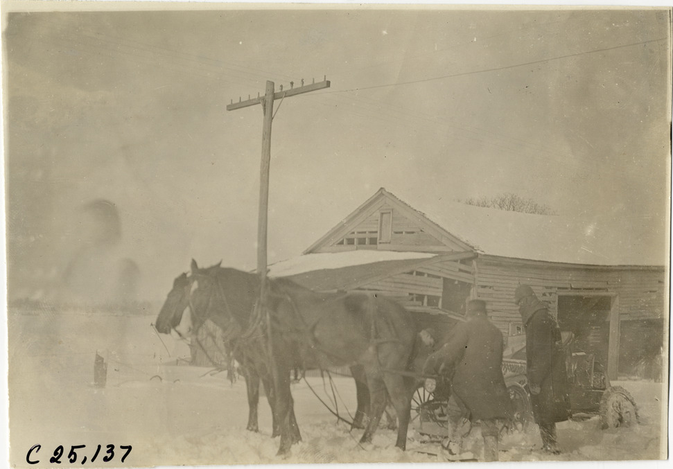 View of team of two horses towing Hupmobile car on snow-covered ground during the 1910 Hupmobile Detroit to New York tour. Two men stand next to car; barn in background. For this endurance run, the Hupp Motor Company sent three Hupmobiles in early January from Detroit to New York for exhibit at the Grand Central Palace Automobile Show. Handwritten on back: "Tours--Hupmobile Detroit to New York Tour, 1910."