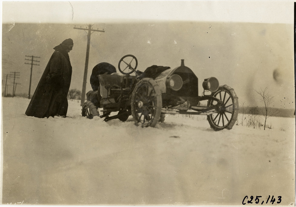 View of two motorists attempting to dislodge Hupmobile car from snow-covered rural road during the 1910 Hupmobile Detroit to New York tour. For this endurance run, the Hupp Motor Company sent three Hupmobiles in early January from Detroit to New York for exhibit at the Grand Central Palace Automobile Show. Stamped on back: "Spooner & Wells, Inc., photographers, telephones 3472-3473 Columbus, 1931 Broadway, New York." Handwritten on back: "Tours--Hupmobile Detroit to New York Tour, 1910."