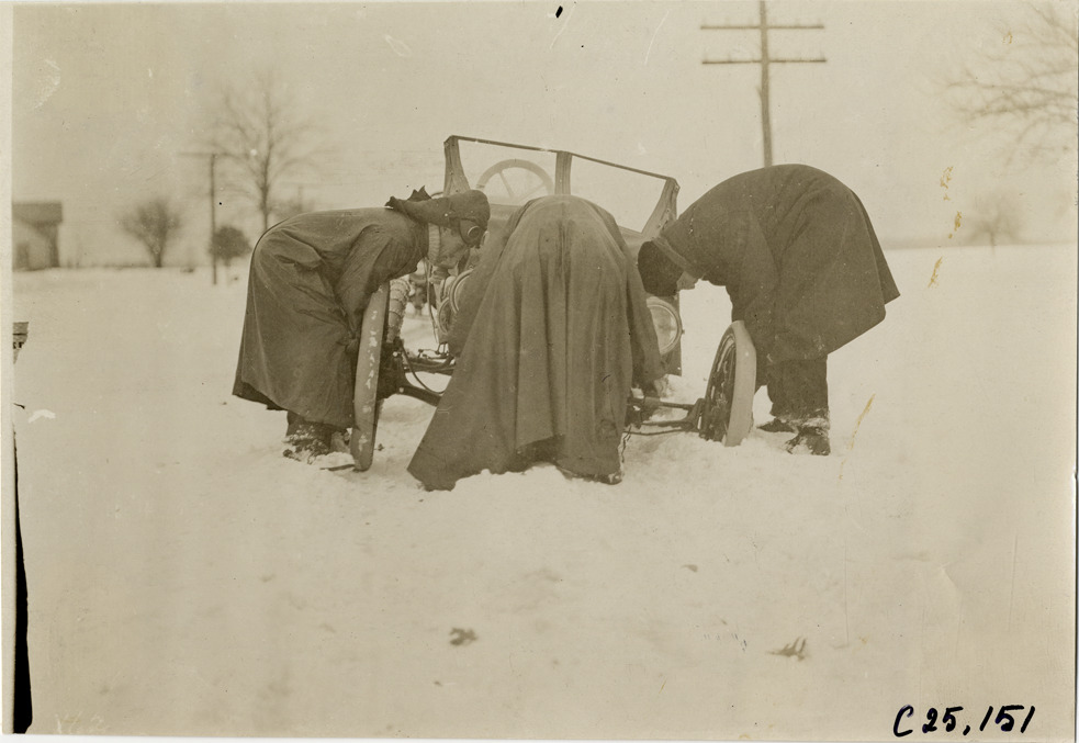 Motorists attempting to dislodge Hupmobile automobile from snow-covered road, 1910 Hupmobile Detroit to New York tour
