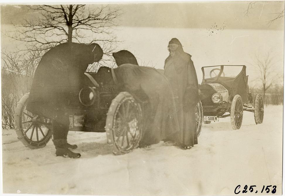 View of motorists with two Hupmobile cars on snow-covered rural road during the 1910 Hupmobile Detroit to New York tour. For this endurance run, the Hupp Motor Company sent three Hupmobiles in early January from Detroit to New York for exhibit at the Grand Central Palace Automobile Show. Handwritten on back: "Tours--Hupmobile Detroit to New York Tour, 1910."