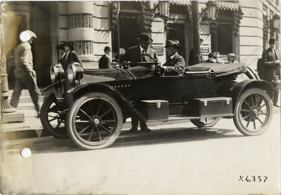 Driver in Hupmobile automobile in front of Pontchartrain Hotel, Detroit, Hupmobile Second Tour Around the World