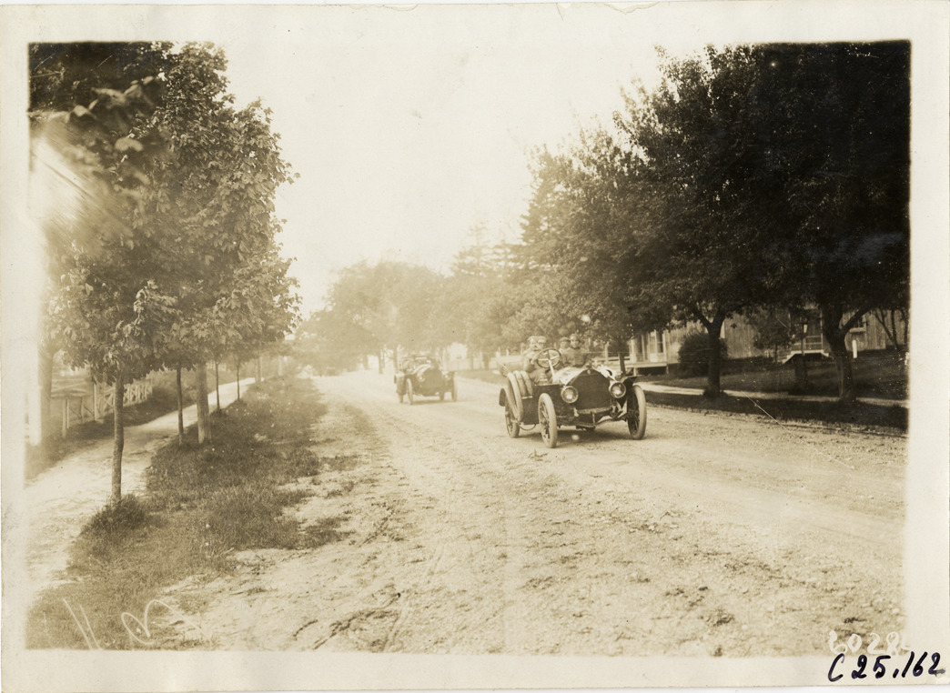 Motorists in automobiles traveling on tree-lined road, 1910 Long Island Endurance Run