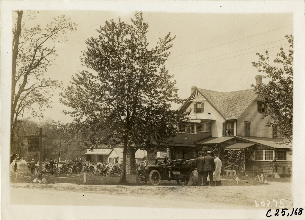 View of motorists with cars in front of the Anchorage Inn during the 1910 Long Island endurance run. Anchorage Inn signpost is displayed on roadside. Members of the Long Island Automobile Club and the Crescent Athletic Club participated in the contest. Stamped on back: "Spooner & Wells, Inc., photographers, telephones 3472-3473 Columbus, 1931 Broadway, New York." Handwritten on back: "Tours--Long Island Endurance Run, 1910."