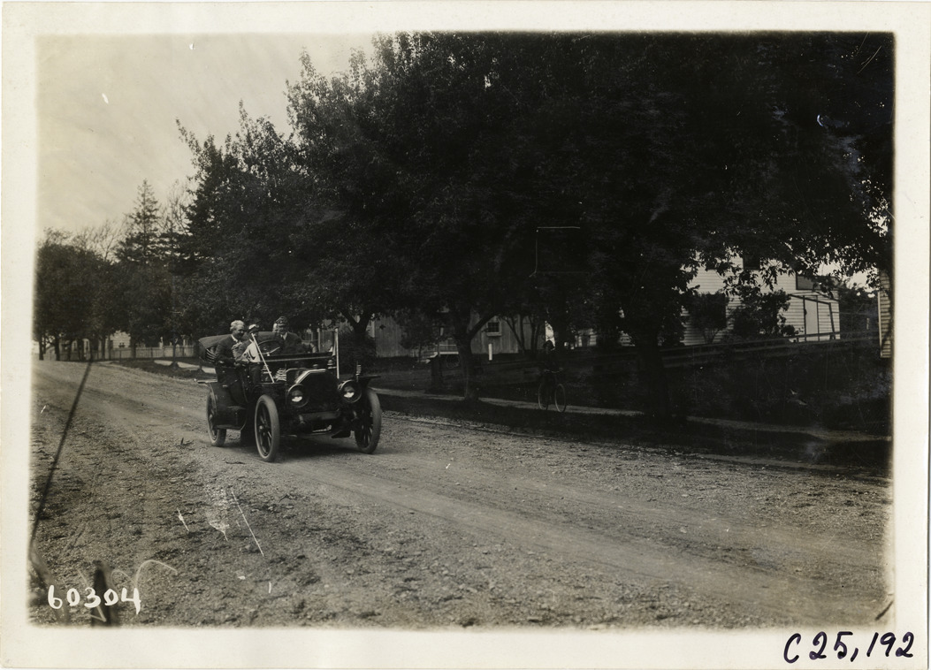 Motorists in automobile traveling on tree-lined road, 1910 Long Island Endurance Run