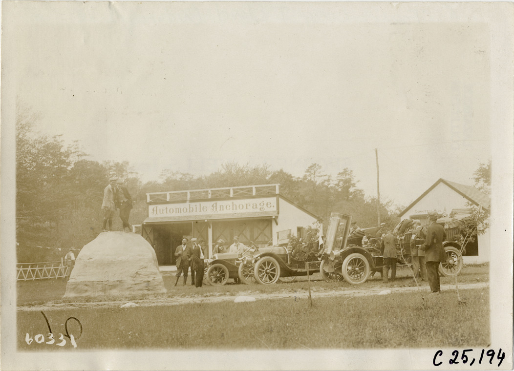 View of two men standing atop rock on the grounds of the Anchorage Inn during the 1910 Long Island endurance run. Motorists with cars on right; "Automobile Anchorage" is painted on wooden garage in background. Members of the Long Island Automobile Club and the Crescent Athletic Club participated in the contest. Stamped on back: "Spooner & Wells, Inc., photographers, telephones 3472-3473 Columbus, 1931 Broadway, New York." Handwritten on back: "Tours--Long Island Endurance Run, 1910."