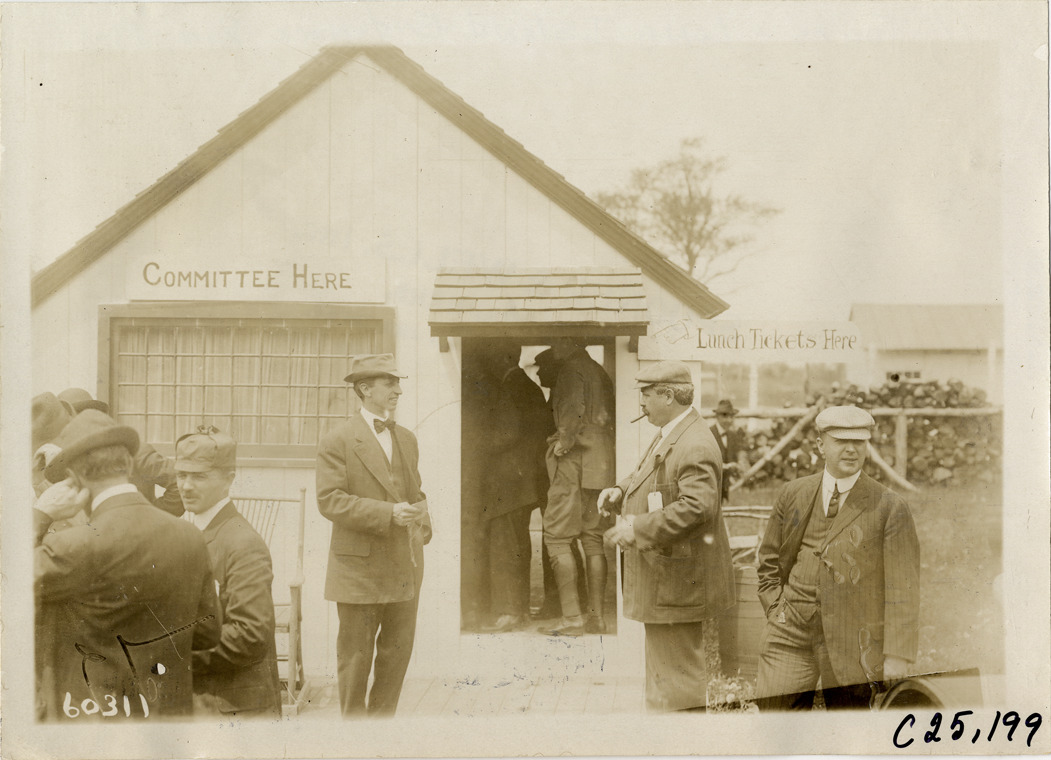 View of motorists on the grounds of the Anchorage Inn during the 1910 Long Island endurance run. Building in background displays "Committee here" sign; "Lunch tickets here" sign on right. Members of the Long Island Automobile Club and the Crescent Athletic Club participated in the contest. Stamped on back: "Spooner & Wells, Inc., photographers, telephones 3472-3473 Columbus, 1931 Broadway, New York." Handwritten on back: "Tours--Long Island Endurance Run, 1910."