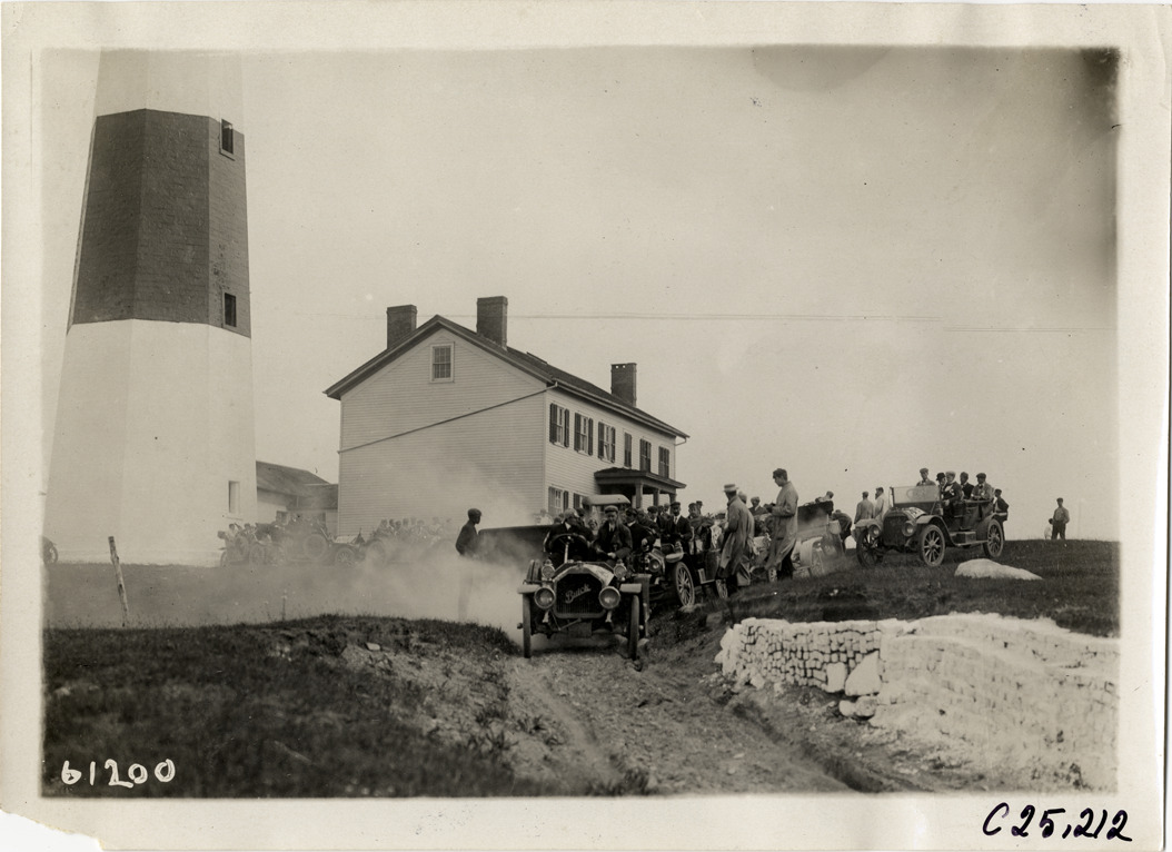 View of motorists with cars in front of the Montauk Point lighthouse during the 1910 Montauk Point Reliability Run. Buick car in foreground. Sponsored by the Motor Contest Association, the two-day endurance run, also known as the "Montauk Light or Bust" reliability run, took place on Long Island. Stamped on back: "Spooner & Wells, Inc., photographers, telephones 3472-3473 Columbus, 1931 Broadway, New York." Handwritten on back: "Tours--Montauk Point Reliability Run, 1910."