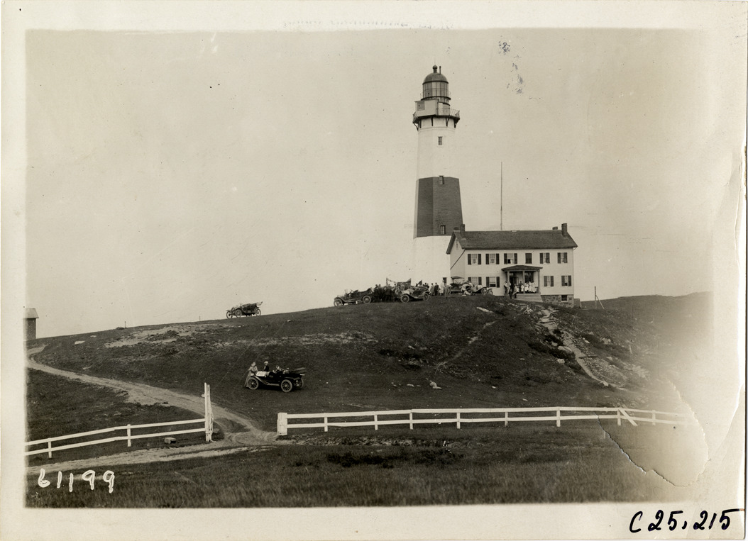 Distant view of motorists with cars in front of the Montauk Point lighthouse during the 1910 Montauk Point Reliability Run. Sponsored by the Motor Contest Association, the two-day endurance run, also known as the "Montauk Light or Bust" reliability run, took place on Long Island. Stamped on back: "Spooner & Wells, Inc., photographers, telephones 3472-3473 Columbus, 1931 Broadway, New York." Handwritten on back: "Tours--Montauk Point Reliability Run, 1910."