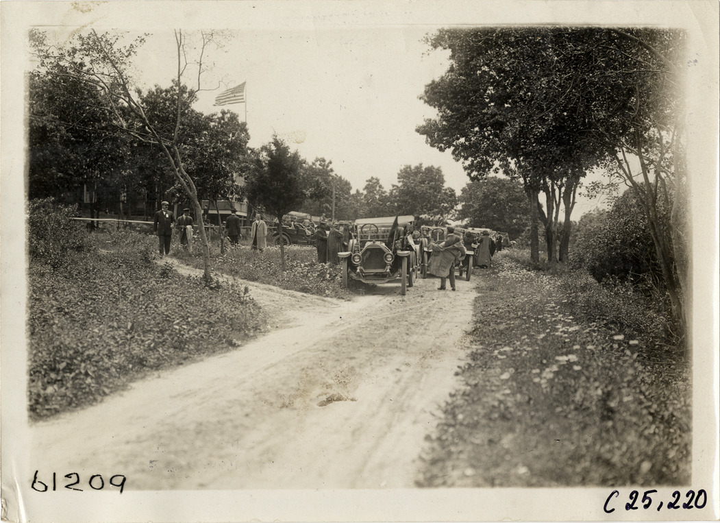 View of motorists with cars in road during the 1910 Montauk Point Reliability Run. Building and American flag are partially visible behind trees. Sponsored by the Motor Contest Association, the two-day endurance run, also known as the "Montauk Light or Bust" reliability run, took place on Long Island. Stamped on back: "Spooner & Wells, Inc., photographers, telephones 3472-3473 Columbus, 1931 Broadway, New York." Handwritten on back: "Tours--Montauk Point Reliability Run, 1910."