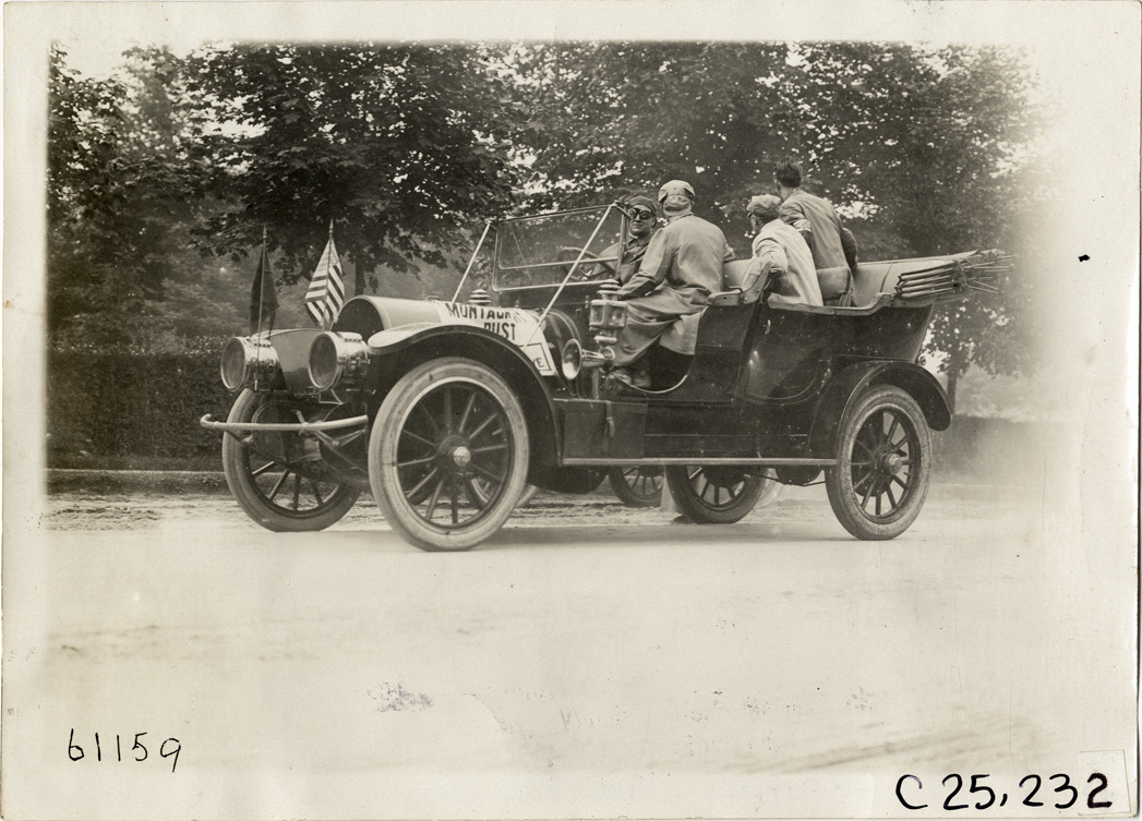 View of motorists in Franklin car during the 1910 Montauk Point Reliability Run. Sponsored by the Motor Contest Association, the two-day endurance run, also known as the "Montauk Light or Bust" reliability run, took place on Long Island. Stamped on back: "Spooner & Wells, Inc., photographers, telephones 3472-3473 Columbus, 1931 Broadway, New York." Handwritten on back: "Tours--Montauk Point Reliability Run, 1910."