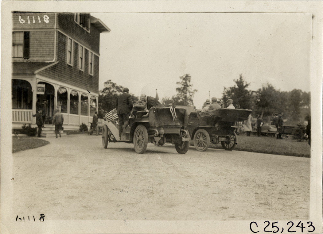 Rear view of motorists in two cars parked in driveway in front of Shingle style building on the grounds of the Chateau des Beaux Arts in Huntington, Long Island during the 1910 Montauk Point Reliability Run. Sponsored by the Motor Contest Association, the two-day endurance run, also known as the "Montauk Light or Bust" reliability run, took place on Long Island. Stamped on back: "Spooner & Wells, Inc., photographers, telephones 3472-3473 Columbus, 1931 Broadway, New York." Handwritten on back: "Tours--Montauk Point Reliability Run, 1910."
