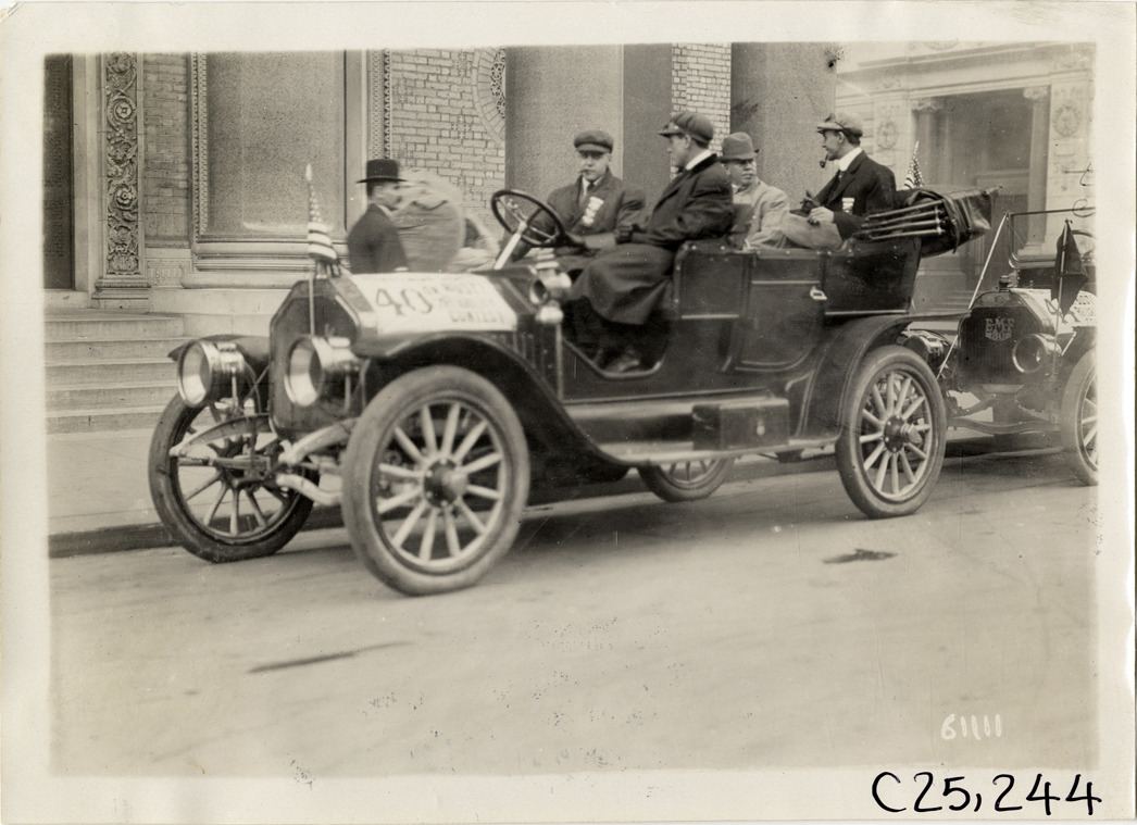 View of motorists in Buick car no. 40 at the start of the 1910 Montauk Point Reliability Run in New York, New York. Sponsored by the Motor Contest Association, the two-day endurance run, also known as the "Montauk Light or Bust" reliability run, took place on Long Island. Stamped on back: "Spooner & Wells, Inc., photographers, telephones 3472-3473 Columbus, 1931 Broadway, New York." Handwritten on back: "Tours--Montauk Point Reliability Run, 1910."