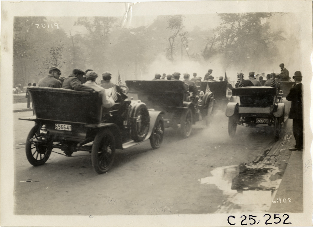 Rear view of motorists in cars lined up in street during the 1910 Montauk Point Reliability Run. Sponsored by the Motor Contest Association, the two-day endurance run, also known as the "Montauk Light or Bust" reliability run, took place on Long Island. Stamped on back: "Spooner & Wells, Inc., photographers, telephones 3472-3473 Columbus, 1931 Broadway, New York." Handwritten on back: "Tours--Montauk Point Reliability Run, 1910."