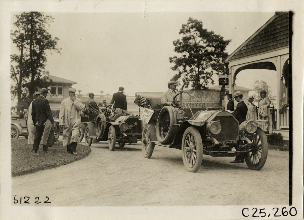 View of motorists with Mitchell and Buick cars on the grounds of the Chateau des Beaux Arts in Huntington, Long Island during the 1910 Montauk Point Reliability Run. Sponsored by the Motor Contest Association, the two-day endurance run, also known as the "Montauk Light or Bust" reliability run, took place on Long Island. Stamped on back: "Spooner & Wells, Inc., photographers, telephones 3472-3473 Columbus, 1931 Broadway, New York." Handwritten on back: "Tours--Montauk Point Reliability Run, 1910."