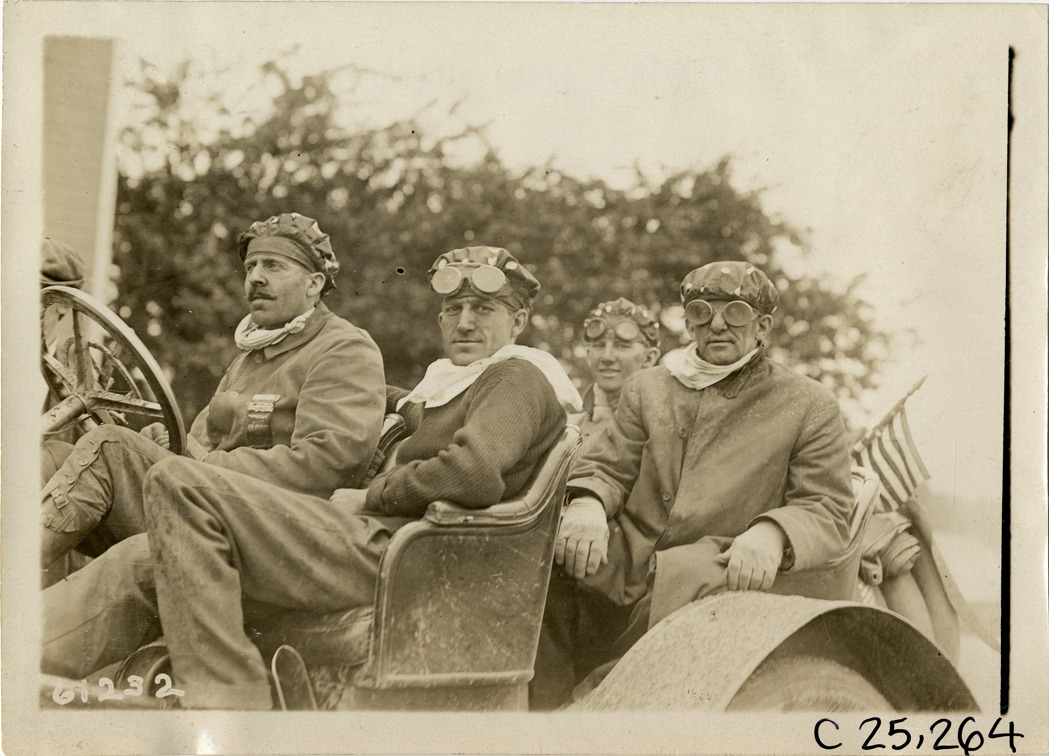 Close-up view of four men in car, wearing caps and goggles, during the 1910 Montauk Point Reliability Run. Sponsored by the Motor Contest Association, the two-day endurance run, also known as the "Montauk Light or Bust" reliability run, took place on Long Island. Stamped on back: "Spooner & Wells, Inc., photographers, telephones 3472-3473 Columbus, 1931 Broadway, New York." Handwritten on back: "Tours--Montauk Point Reliability Run, 1910."