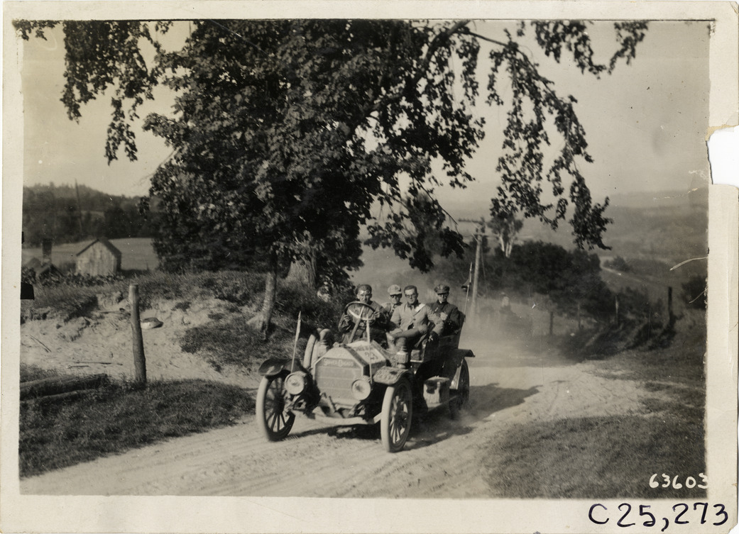 View of motorists in Staver-Chicago car traveling on rural dirt road during the 1910 Munsey Historic Tour. Organized by the Munsey newspapers, the endurance contest covered a route through ten states. Stamped on back: "Spooner & Wells, Inc., photographers, telephones 3472-3473 Columbus, 1931 Broadway, New York." Handwritten on back: "Tours--Munsey Historic Tour, 1910."