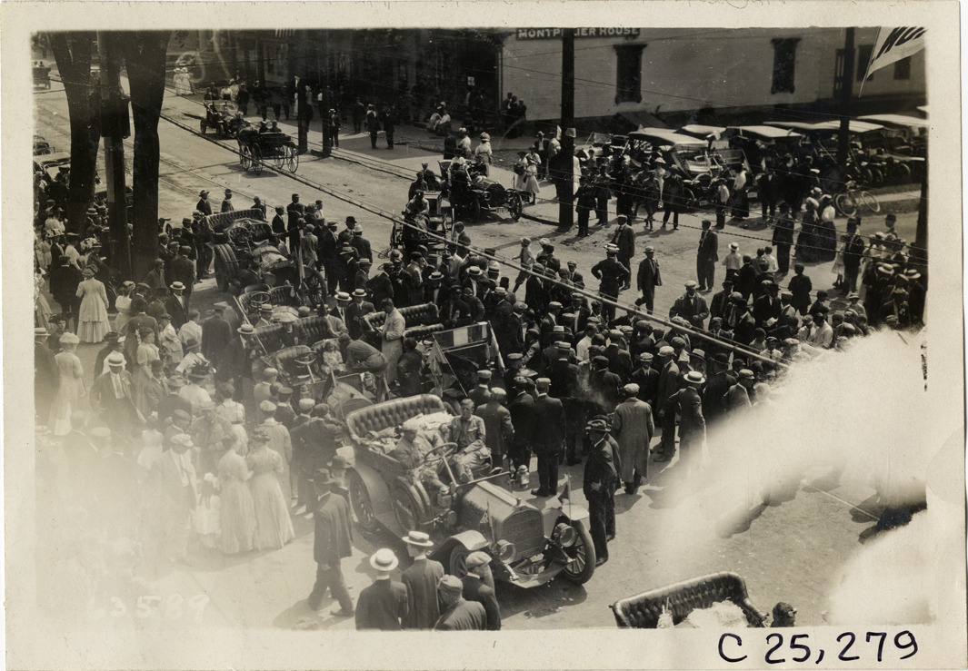 Bird's-eye view of crowd surrounding cars in street at Montpelier, Vermont during the 1910 Munsey Historic Tour. Montpelier House in background. Organized by the Munsey newspapers, the endurance contest covered a route through ten states. Stamped on back: "Spooner & Wells, Inc., photographers, telephones 3472-3473 Columbus, 1931 Broadway, New York." Handwritten on back: "Tours--Munsey Historic Tour, 1910."