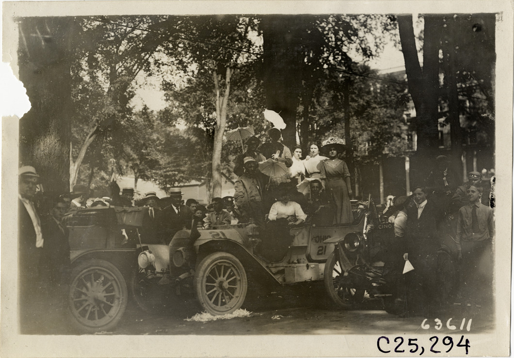 View of men and women posing in Ohio car no. 21 during the 1910 Munsey Historic Tour. Organized by the Munsey newspapers, the endurance contest covered a route through ten states. Stamped on back: "Spooner & Wells, Inc., photographers, telephones 3472-3473 Columbus, 1931 Broadway, New York." Handwritten on back: "Tours--Munsey Historic Tour, 1910."