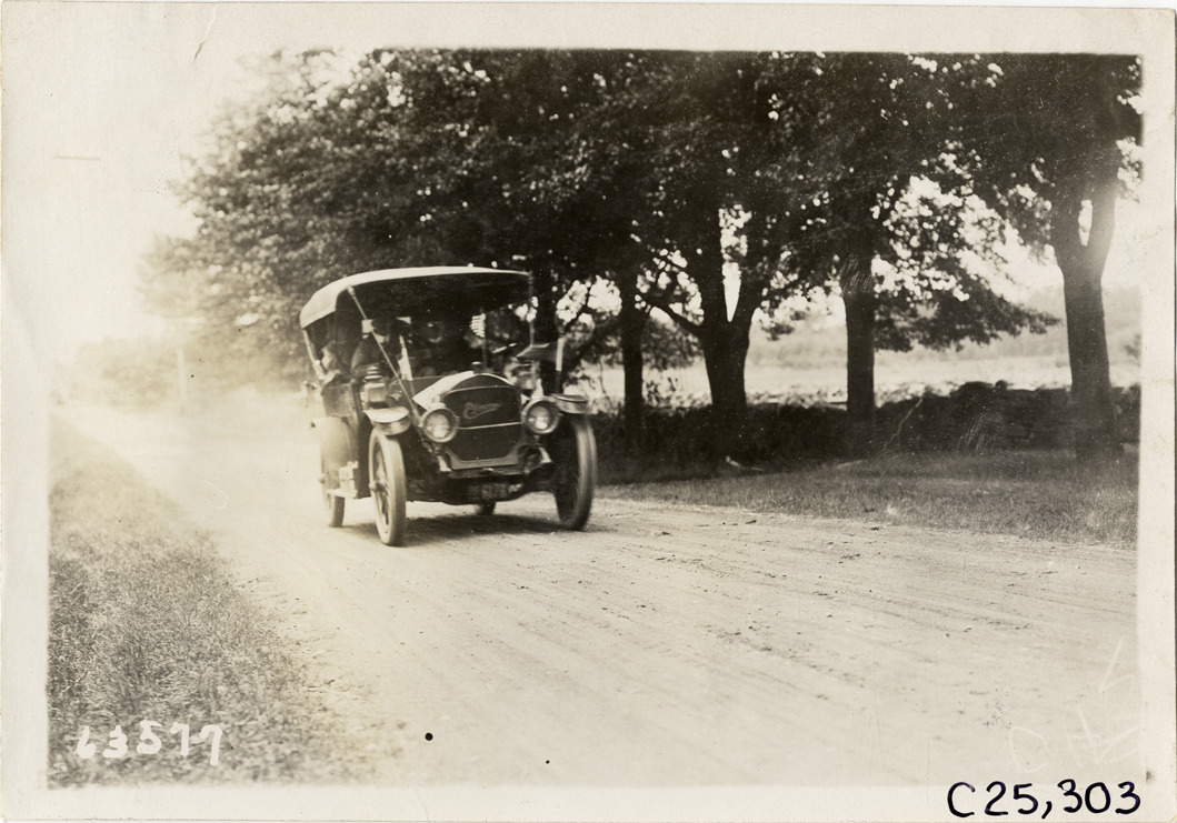 View of motorists in Elmore car traveling on rural dirt road during the 1910 Munsey Historic Tour. Organized by the Munsey newspapers, the endurance contest covered a route through ten states. Stamped on back: "Spooner & Wells, Inc., photographers, telephones 3472-3473 Columbus, 1931 Broadway, New York." Handwritten on back: "Tours--Munsey Historic Tour, 1910."