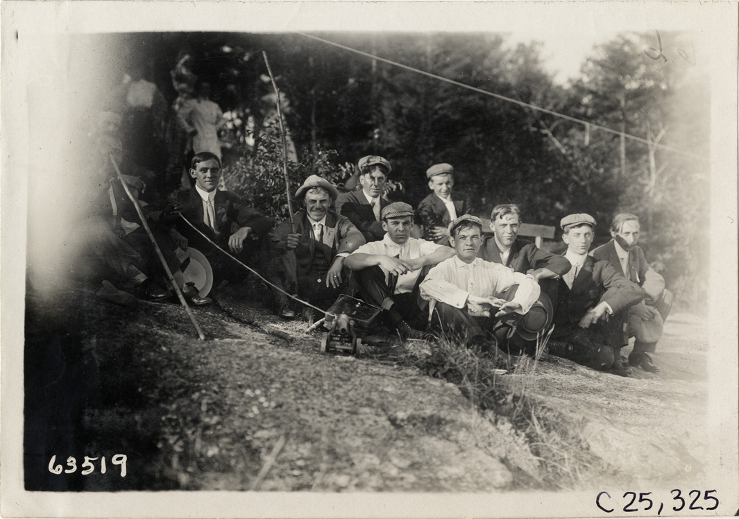 View of group of men posing outdoors during the 1910 Munsey Historic Tour. Organized by the Munsey newspapers, the endurance contest covered a route through ten states. Stamped on back: "Spooner & Wells, Inc., photographers, telephones 3472-3473 Columbus, 1931 Broadway, New York." Handwritten on back: "Tours--Munsey Historic Tour, 1910."