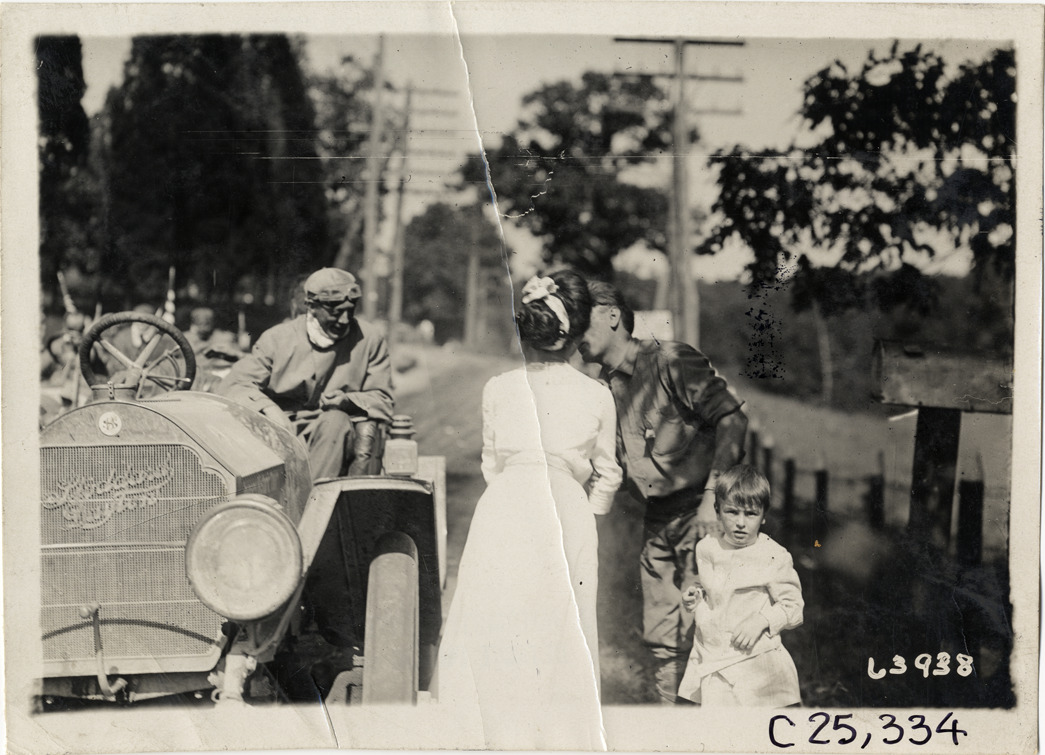 View of man and woman kissing next to Stoddard-Dayton car during the 1910 Munsey Historic Tour. Motorist sits in car; child in foreground. Organized by the Munsey newspapers, the endurance contest covered a route through ten states. Stamped on back: "Spooner & Wells, Inc., photographers, telephones 3472-3473 Columbus, 1931 Broadway, New York." Handwritten on back: "Tours--Munsey Historic Tour, 1910."