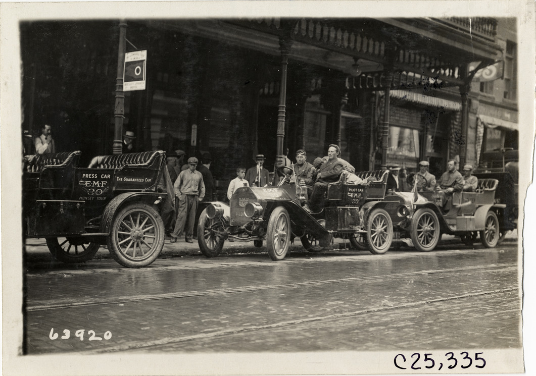E-M-F press and pilot automobiles parked in street, 1910 Munsey Historic Tour