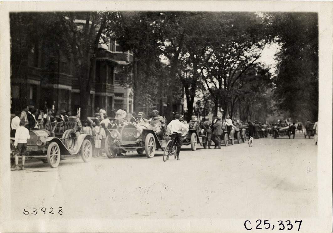 Motorists with automobiles lined up in street, 1910 Munsey Historic Tour
