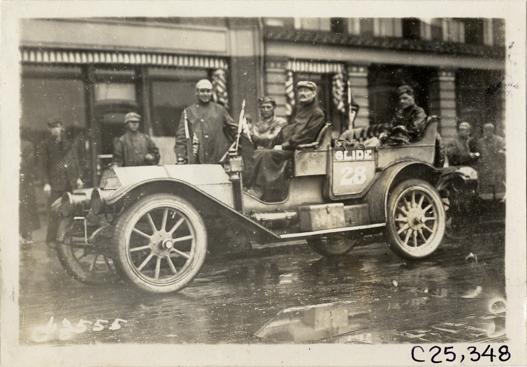 View of motorists posing in Glide car no. 28 during the 1910 Munsey Historic Tour. Organized by the Munsey newspapers, the endurance contest covered a route through ten states. Stamped on back: "Spooner & Wells, Inc., photographers, telephones 3472-3473 Columbus, 1931 Broadway, New York." Handwritten on back: "Tours--Munsey Historic Tour, 1910."