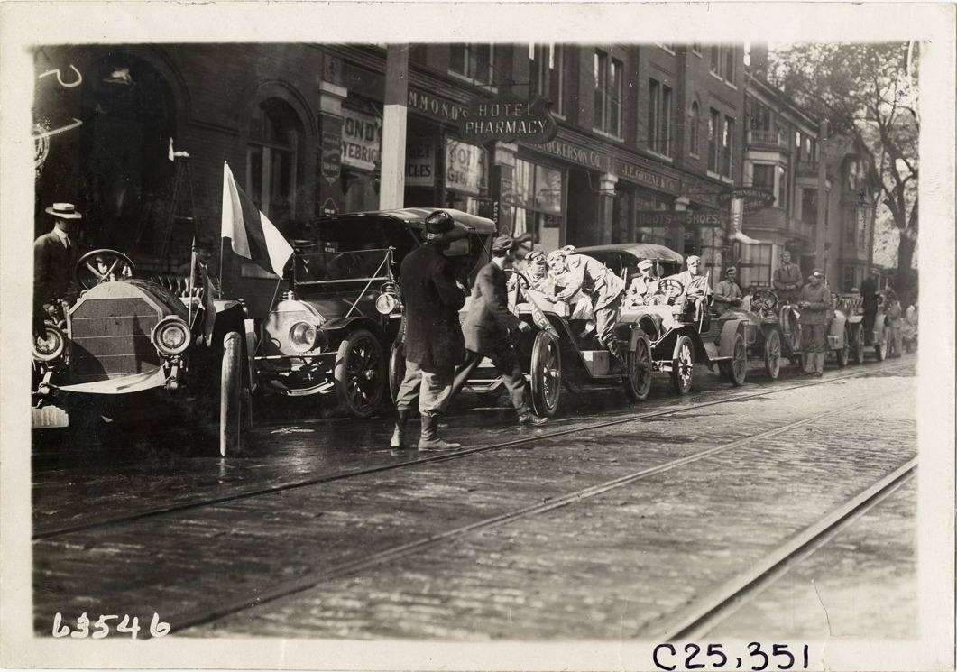 View of motorists in cars parked in front of Lafayette Hotel at Portland, Maine during the 1910 Munsey Historic Tour. Commercial buildings in background. Organized by the Munsey newspapers, the endurance contest covered a route through ten states. Stamped on back: "Spooner & Wells, Inc., photographers, telephones 3472-3473 Columbus, 1931 Broadway, New York." Handwritten on back: "Tours--Munsey Historic Tour, 1910."