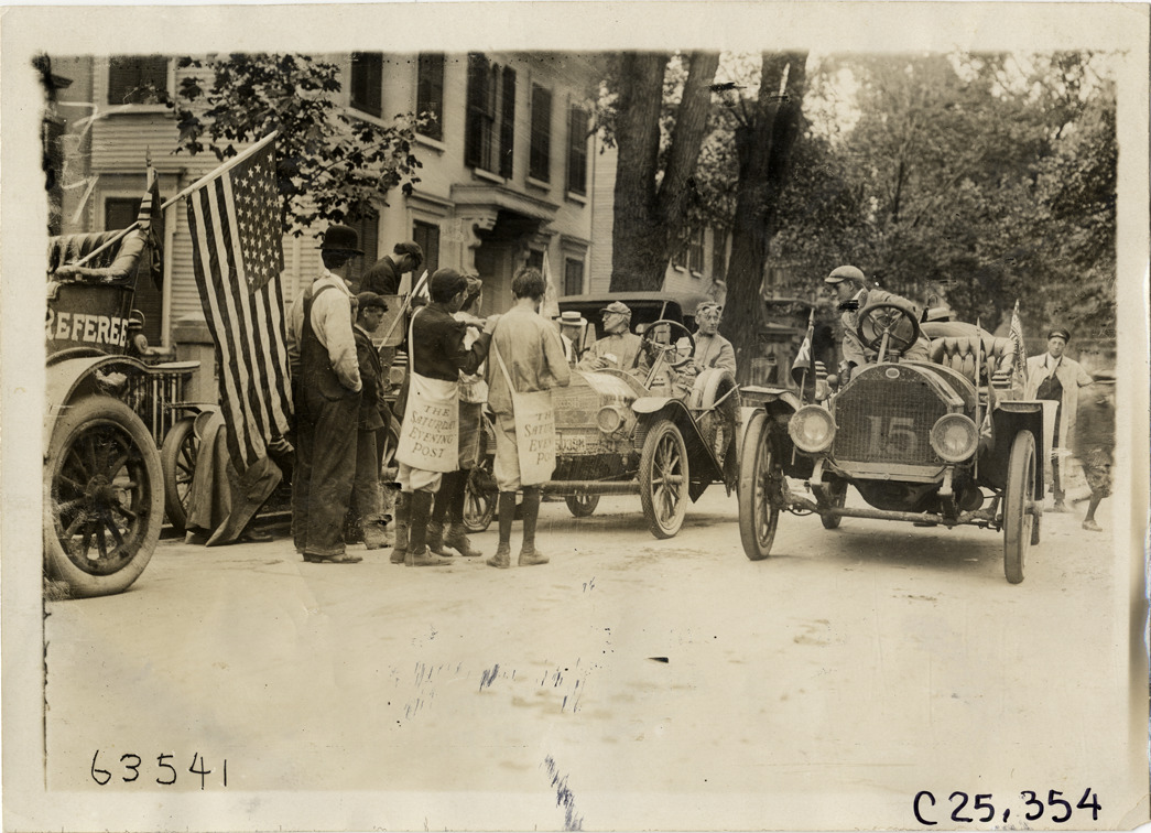 View of motorists in Brush car no. 13 and Regal car no. 15 parked in front of house during the 1910 Munsey Historic Tour. Man wearing overalls and two newsboys, carrying Saturday Evening Post bags, stand in front of cars; referee car and American flag on left. Organized by the Munsey newspapers, the endurance contest covered a route through ten states. Stamped on back: "Spooner & Wells, Inc., photographers, telephones 3472-3473 Columbus, 1931 Broadway, New York." Handwritten on back: "Tours--Munsey Historic Tour, 1910."