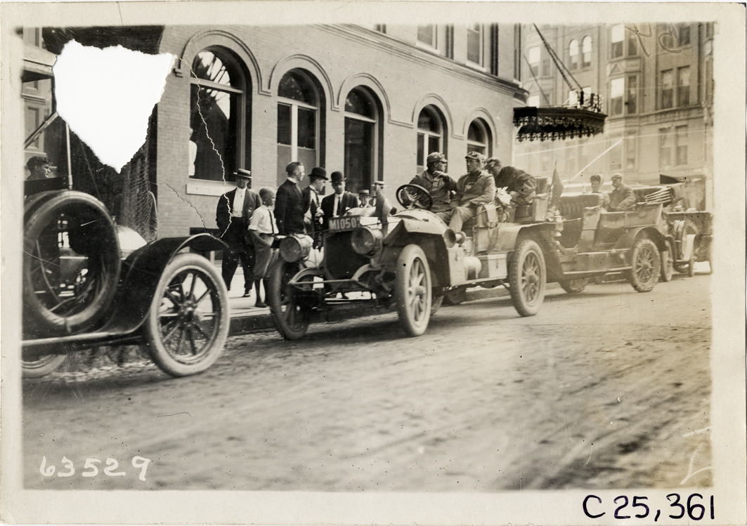 View of motorists in cars in front of Lafayette Hotel at Portland, Maine during the 1910 Munsey Historic Tour. Organized by the Munsey newspapers, the endurance contest covered a route through ten states. Stamped on back: "Spooner & Wells, Inc., photographers, telephones 3472-3473 Columbus, 1931 Broadway, New York." Handwritten on back: "Tours--Munsey Historic Tour, 1910."