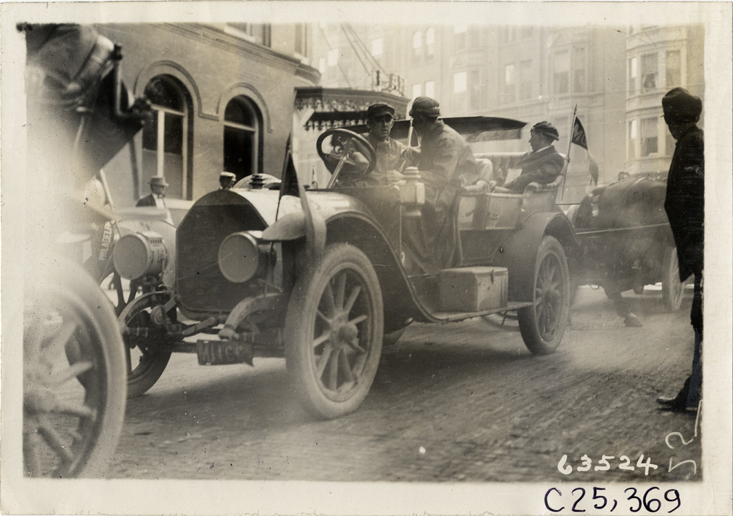 View of motorists in car in front of Lafayette Hotel at Portland, Maine during the 1910 Munsey Historic Tour. Organized by the Munsey newspapers, the endurance contest covered a route through ten states. Stamped on back: "Spooner & Wells, Inc., photographers, telephones 3472-3473 Columbus, 1931 Broadway, New York." Handwritten on back: "Tours--Munsey Historic Tour, 1910."