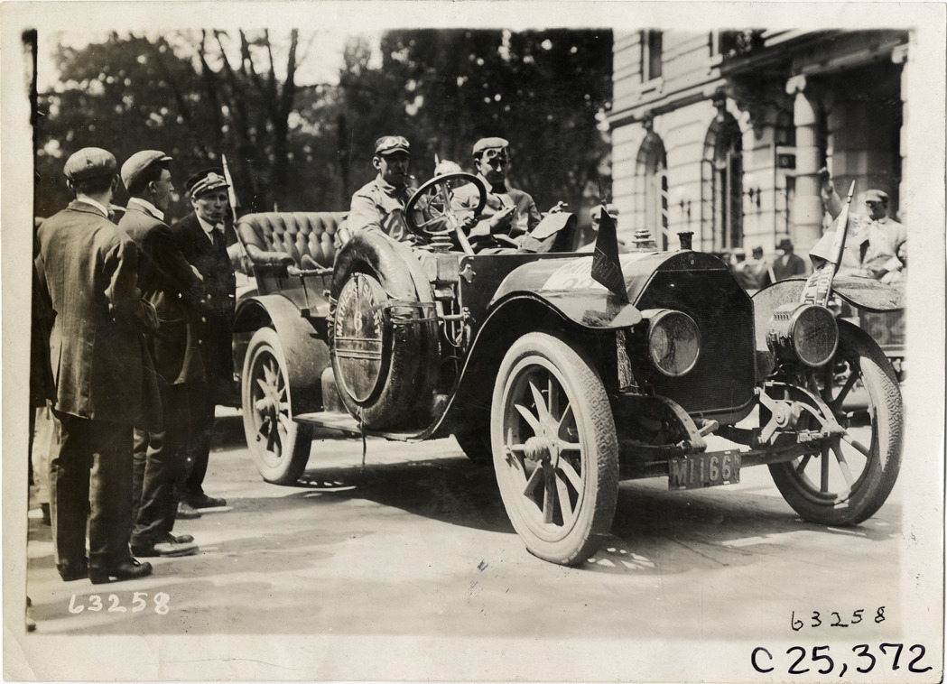 View of motorists posing in Matheson "Silent 6" car no. 33 during the 1910 Munsey Historic Tour. Organized by the Munsey newspapers, the endurance contest covered a route through ten states. Stamped on back: "Spooner & Wells, Inc., photographers, telephones 3472-3473 Columbus, 1931 Broadway, New York." Handwritten on back: "Tours--Munsey Historic Tour, 1910."