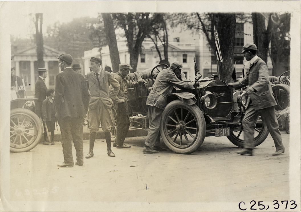 View of motorists looking over Elmore car during the 1910 Munsey Historic Tour. Two young men stand on left. Organized by the Munsey newspapers, the endurance contest covered a route through ten states. Stamped on back: "Spooner & Wells, Inc., photographers, telephones 3472-3473 Columbus, 1931 Broadway, New York." Handwritten on back: "Tours--Munsey Historic Tour, 1910."