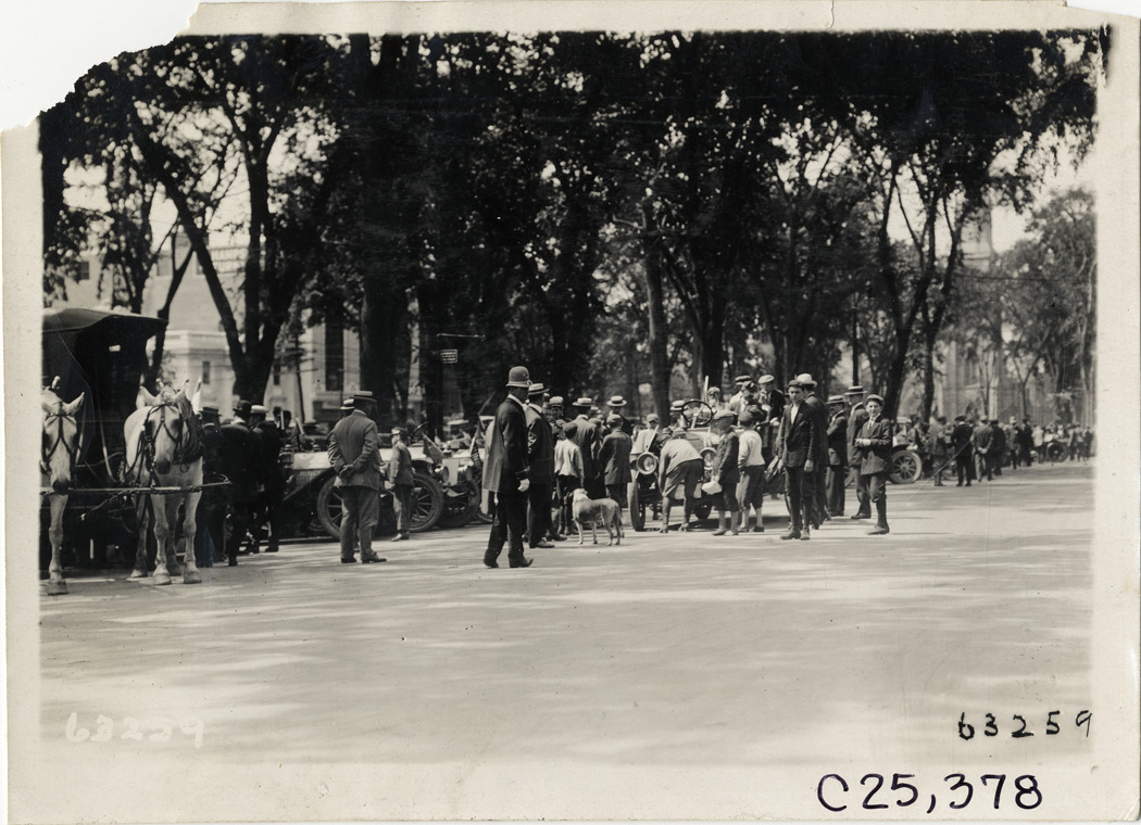 View of motorists and spectators with cars parked in street during the 1910 Munsey Historic Tour. Policeman, dog and horse-drawn wagon in foreground. Organized by the Munsey newspapers, the endurance contest covered a route through ten states. Stamped on back: "Spooner & Wells, Inc., photographers, telephones 3472-3473 Columbus, 1931 Broadway, New York." Handwritten on back: "Tours--Munsey Historic Tour, 1910."