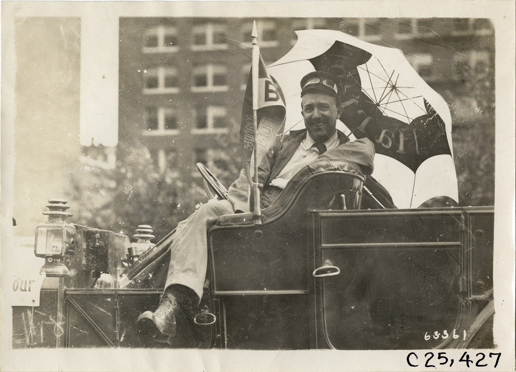 Driver posing with umbrella in automobile, 1910 Munsey Historic Tour