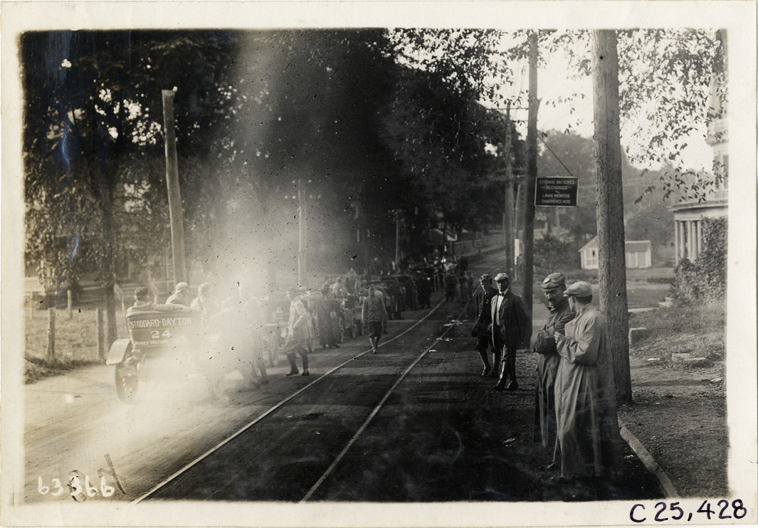 View of motorists with cars lined up in road during the 1910 Munsey Historic Tour. Stoddard-Dayton car no. 24 in foreground. Organized by the Munsey newspapers, the endurance contest covered a route through ten states. Stamped on back: "Spooner & Wells, Inc., photographers, telephones 3472-3473 Columbus, 1931 Broadway, New York." Handwritten on back: "Tours--Munsey Historic Tour, 1910."