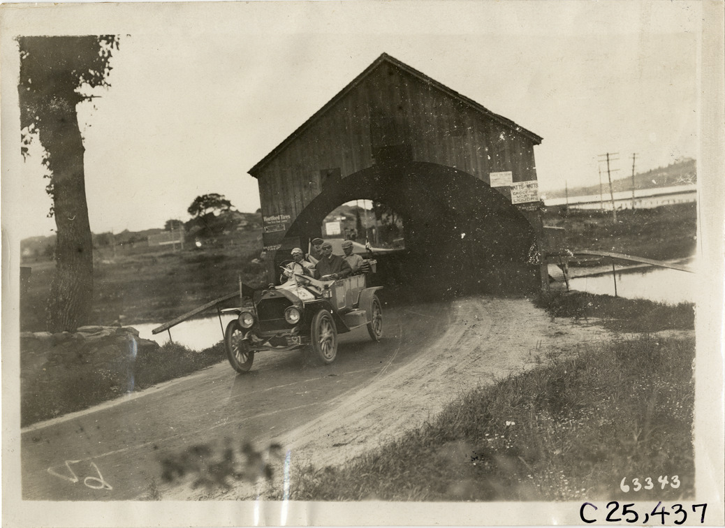 View of motorists in Inter-State car no. 29 exiting covered bridge during the 1910 Munsey Historic Tour. Organized by the Munsey newspapers, the endurance contest covered a route through ten states. Stamped on back: "Spooner & Wells, Inc., photographers, telephones 3472-3473 Columbus, 1931 Broadway, New York." Handwritten on back: "Tours--Munsey Historic Tour, 1910."