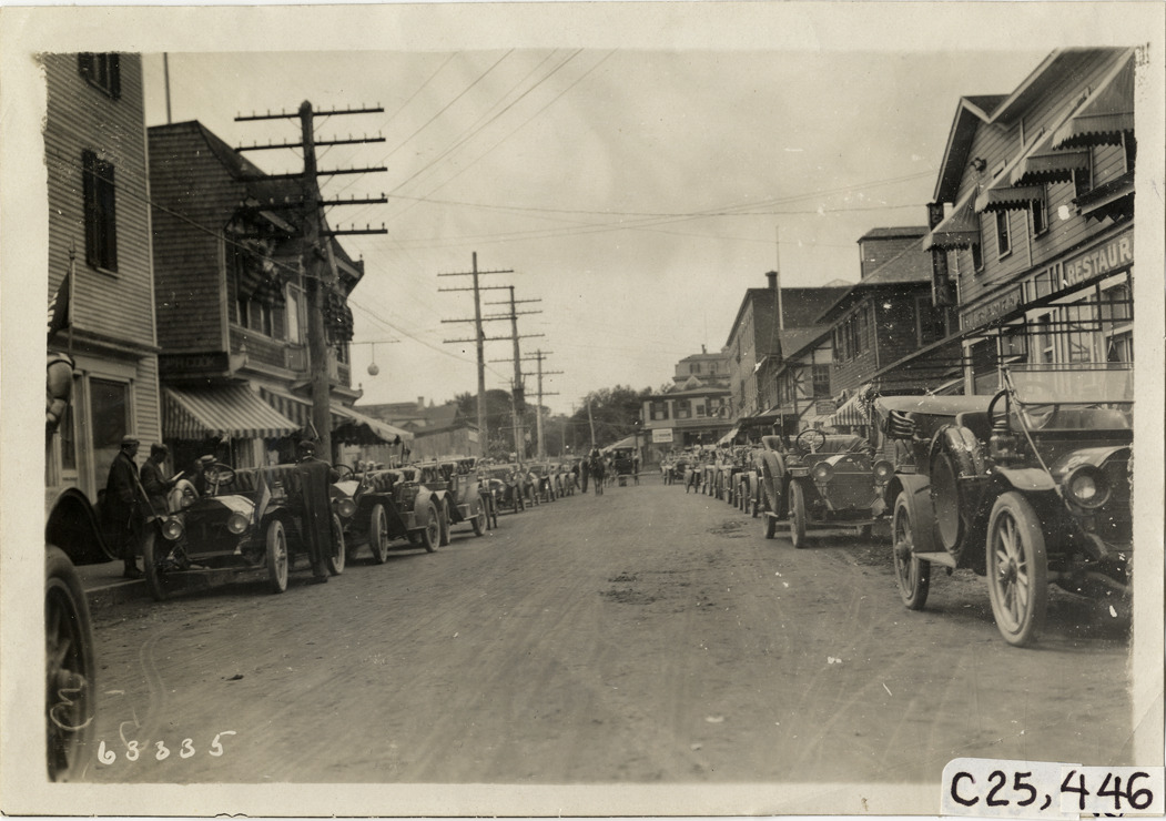 View of cars parked on both sides of street lined with commercial buildings during the 1910 Munsey Historic Tour. Organized by the Munsey newspapers, the endurance contest covered a route through ten states. Stamped on back: "Spooner & Wells, Inc., photographers, telephones 3472-3473 Columbus, 1931 Broadway, New York." Handwritten on back: "Tours--Munsey Historic Tour, 1910."