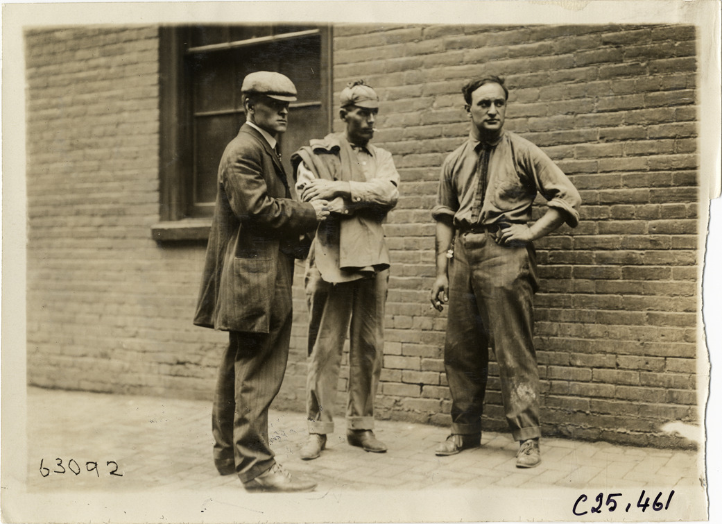 View of three men in front of Penn Motor Car Co. Garage during the 1910 Munsey Historic Tour. Organized by the Munsey newspapers, the endurance contest covered a route through ten states. Stamped on back: "Spooner & Wells, Inc., photographers, telephones 3472-3473 Columbus, 1931 Broadway, New York." Handwritten on back: "Tours--Munsey Historic Tour, 1910."