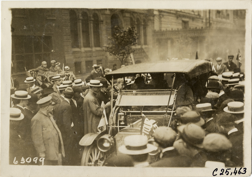 Crowd surrounding motorists in Crawford automobile, 1910 Munsey Historic Tour