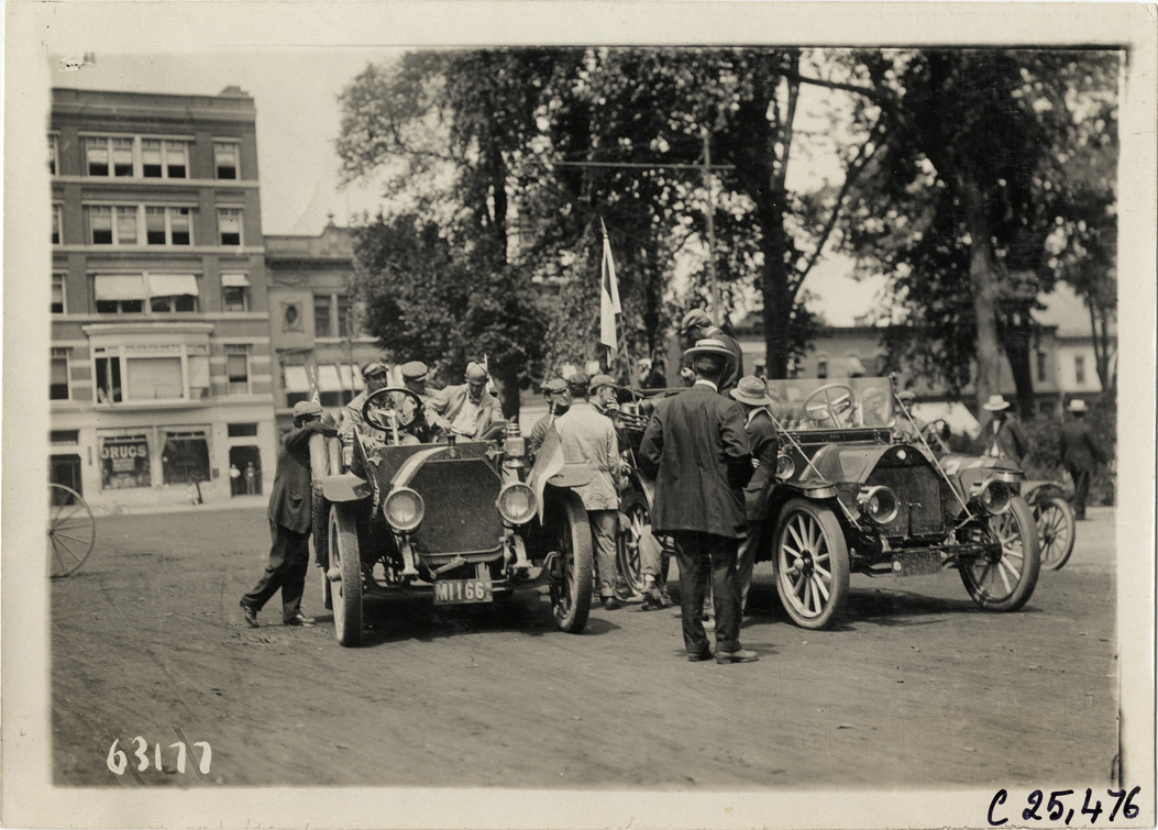 View of motorists and spectators surrounding Matheson car no. 33 and unidentified car during the 1910 Munsey Historic Tour. Organized by the Munsey newspapers, the endurance contest covered a route through ten states. Stamped on back: "Spooner & Wells, Inc., photographers, telephones 3472-3473 Columbus, 1931 Broadway, New York." Handwritten on back: "Tours--Munsey Historic Tour, 1910."