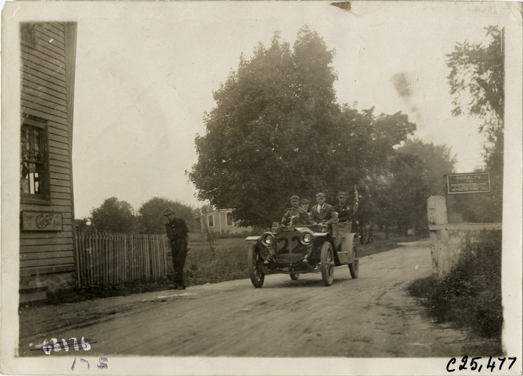 Motorists in Cino automobile passing through toll gate, 1910 Munsey Historic Tour