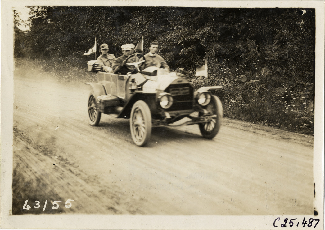 View of motorists in car traveling on rural dirt road during the 1910 Munsey Historic Tour. Organized by the Munsey newspapers, the endurance contest covered a route through ten states. Stamped on back: "Spooner & Wells, Inc., photographers, telephones 3472-3473 Columbus, 1931 Broadway, New York." Handwritten on back: "Tours--Munsey Historic Tour, 1910."