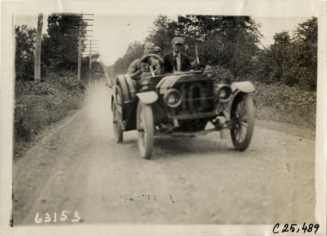 View of motorists in Warren-Detroit car no. 10 traveling on rural dirt road during the 1910 Munsey Historic Tour. Organized by the Munsey newspapers, the endurance contest covered a route through ten states. Stamped on back: "Spooner & Wells, Inc., photographers, telephones 3472-3473 Columbus, 1931 Broadway, New York." Handwritten on back: "Tours--Munsey Historic Tour, 1910."