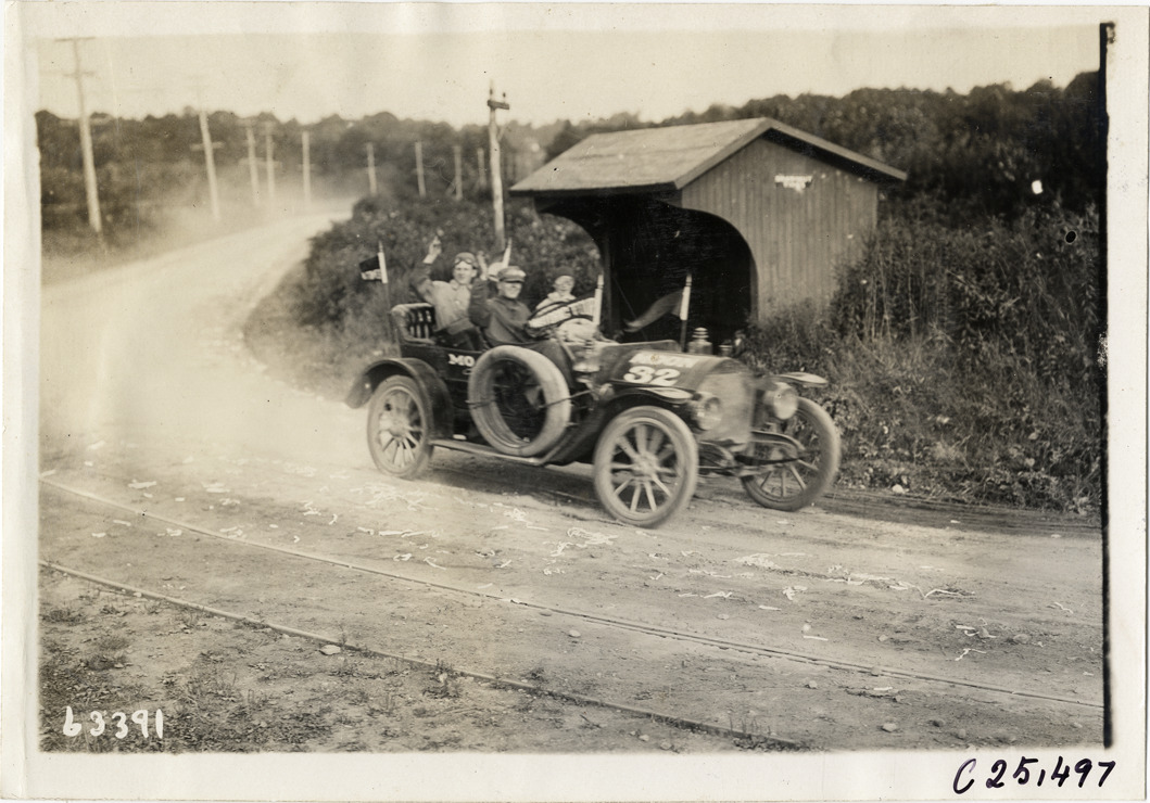 View of motorists in Moon car no. 32 traveling on rural dirt road past roadside shelter during the 1910 Munsey Historic Tour. Organized by the Munsey newspapers, the endurance contest covered a route through ten states. Stamped on back: "Spooner & Wells, Inc., photographers, telephones 3472-3473 Columbus, 1931 Broadway, New York." Handwritten on back: "Tours--Munsey Historic Tour, 1910."