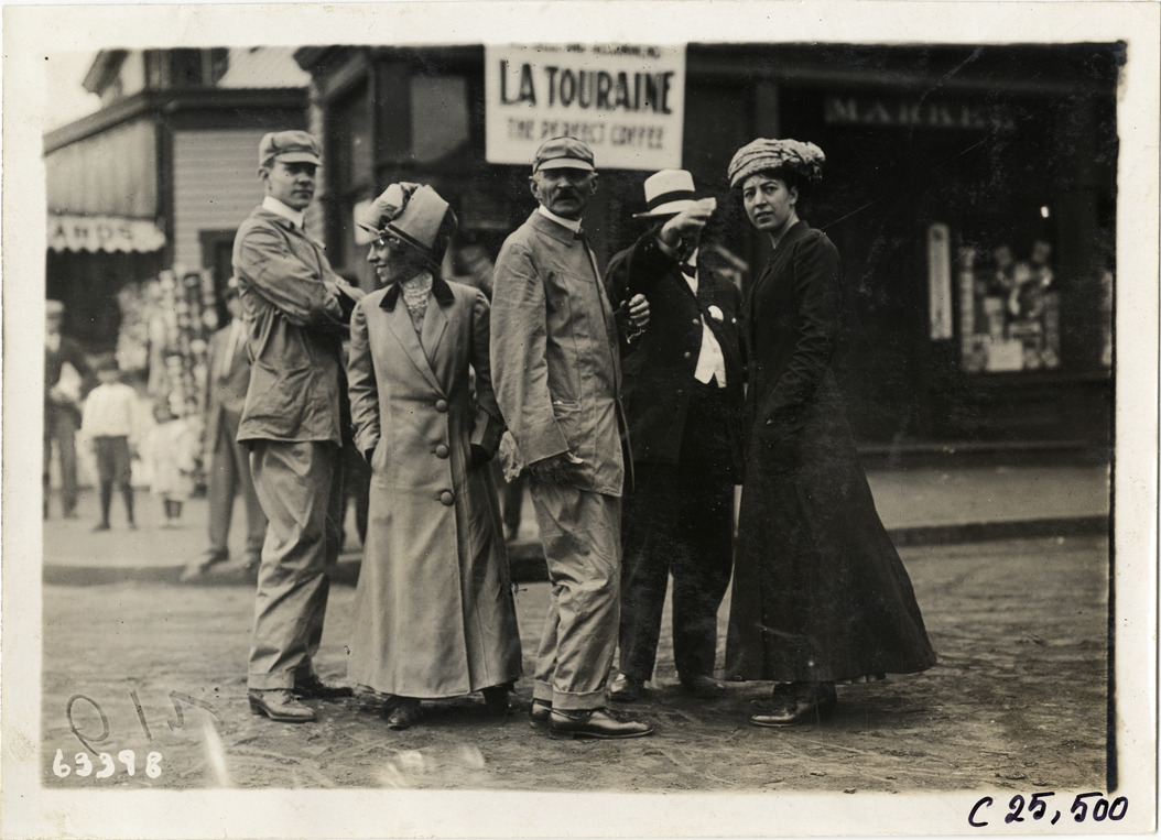 View of three men and two women standing in middle of street during the 1910 Munsey Historic Tour. Two men wear driving clothes. Organized by the Munsey newspapers, the endurance contest covered a route through ten states. Stamped on back: "Spooner & Wells, Inc., photographers, telephones 3472-3473 Columbus, 1931 Broadway, New York." Handwritten on back: "Tours--Munsey Historic Tour, 1910."