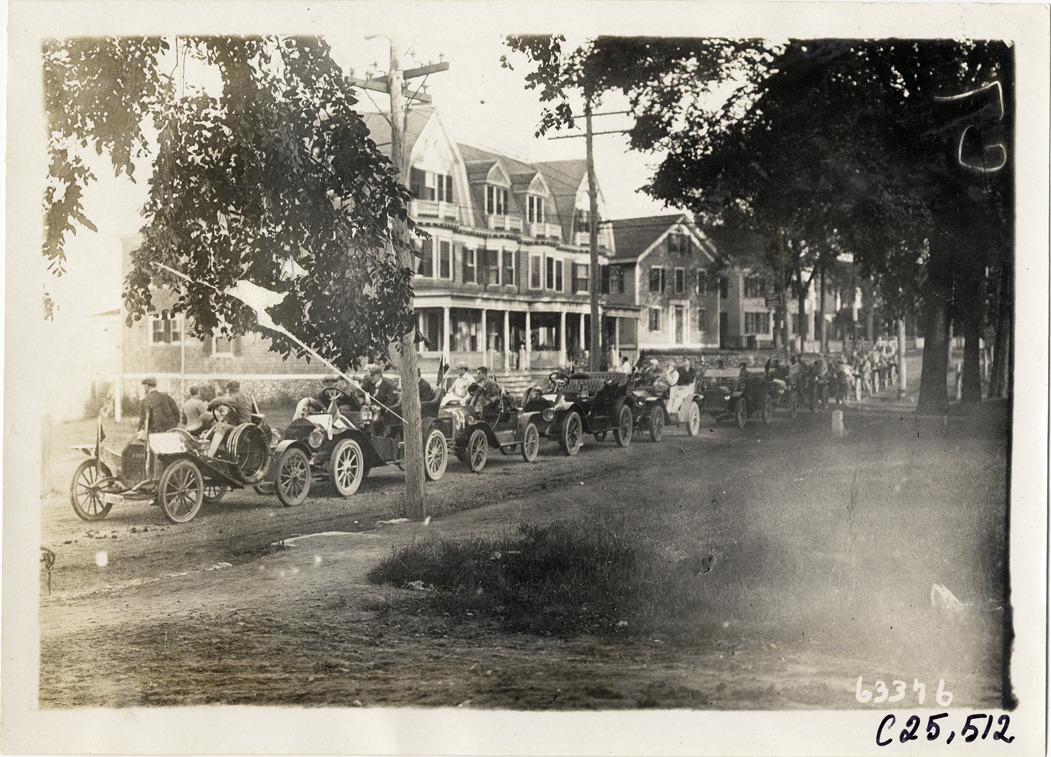 Automobiles lined up in street, 1910 Munsey Historic Tour